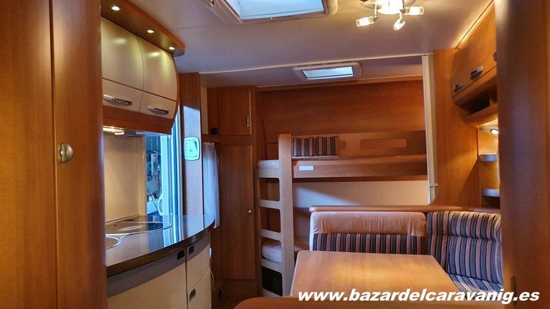 Caravana d'ocasió en molt bon estat. Dos ambients distribuïts en saló menjador convertible en llit de matrimoni i dos lliteres. Any 2010